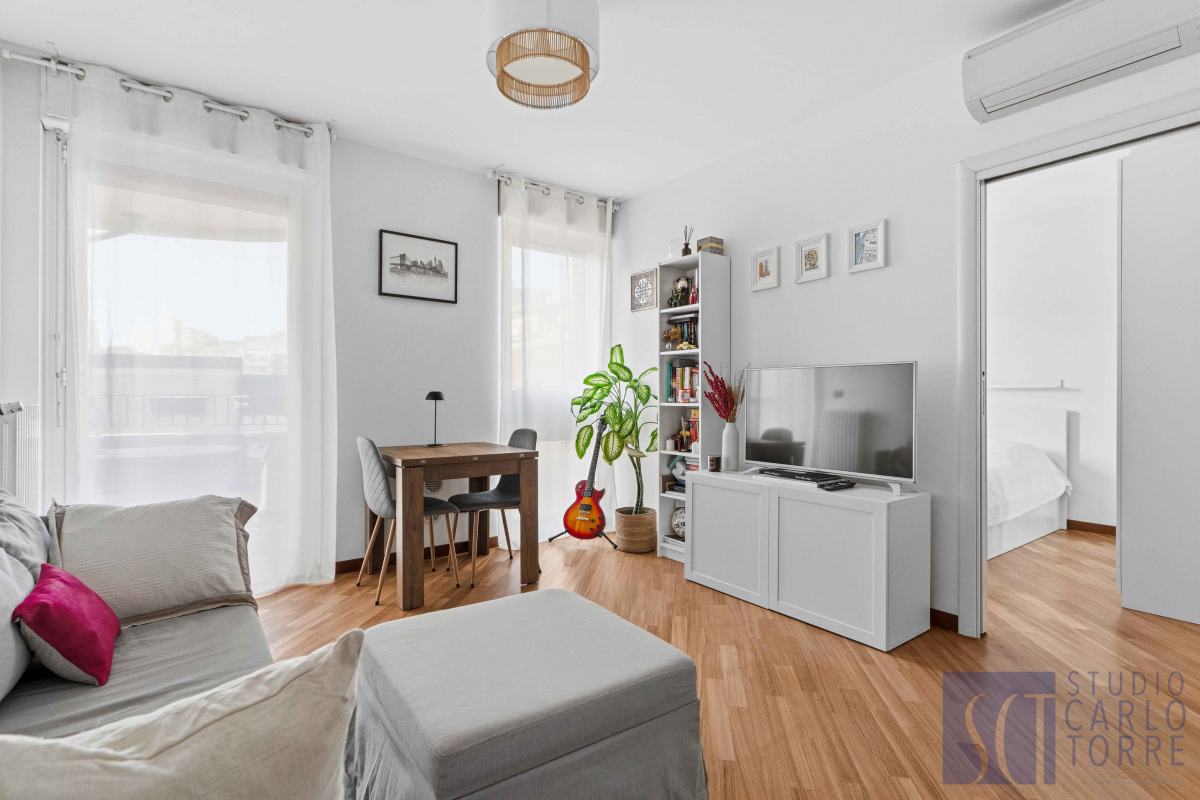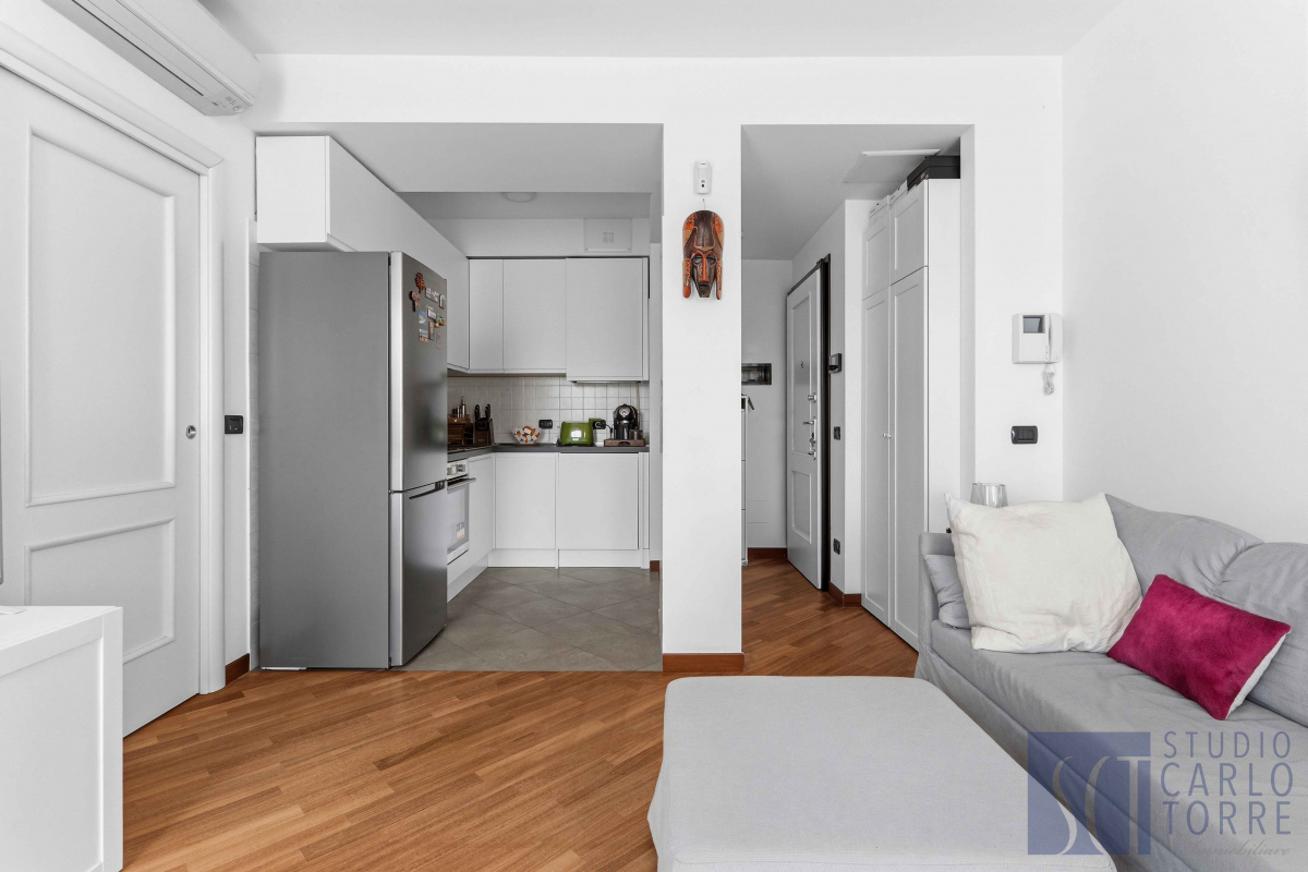 L'immobile è composto da un'elegante zona living con cucina a vista, comodo terrazzo, camera da letto matrimoniale e bagno con box doccia e balcone.