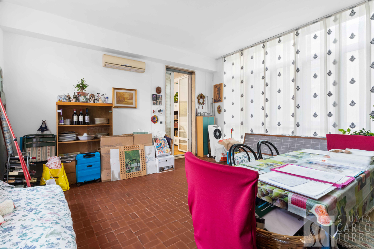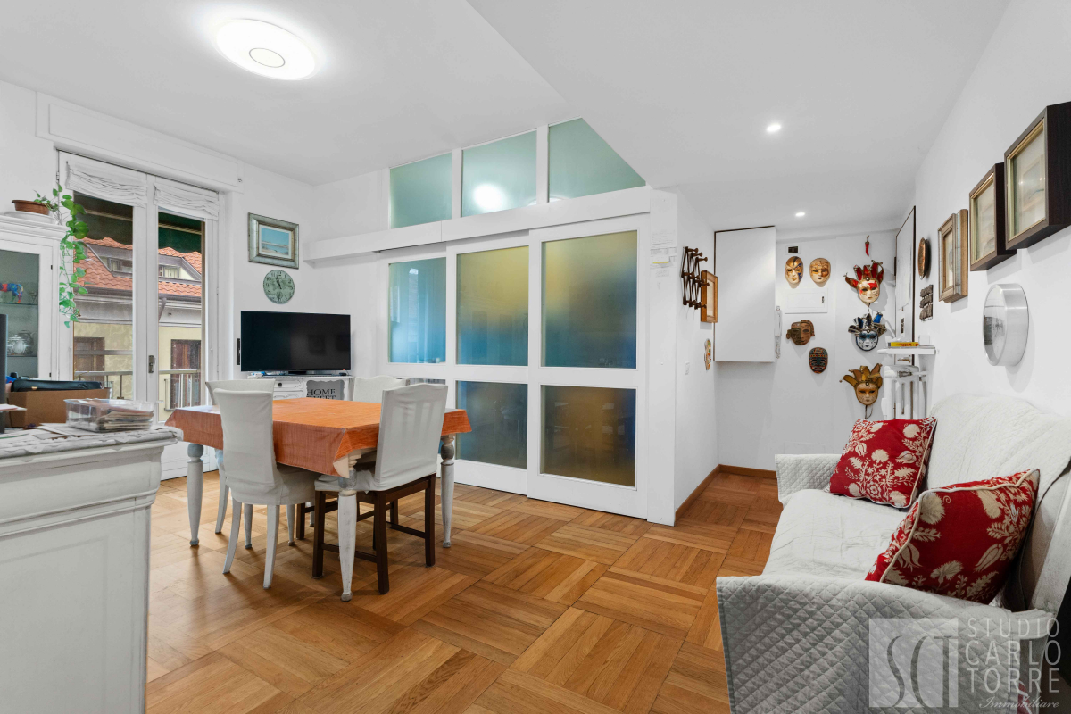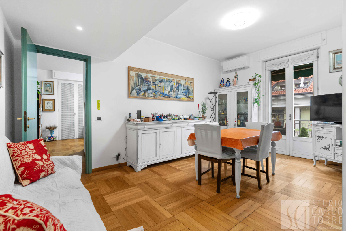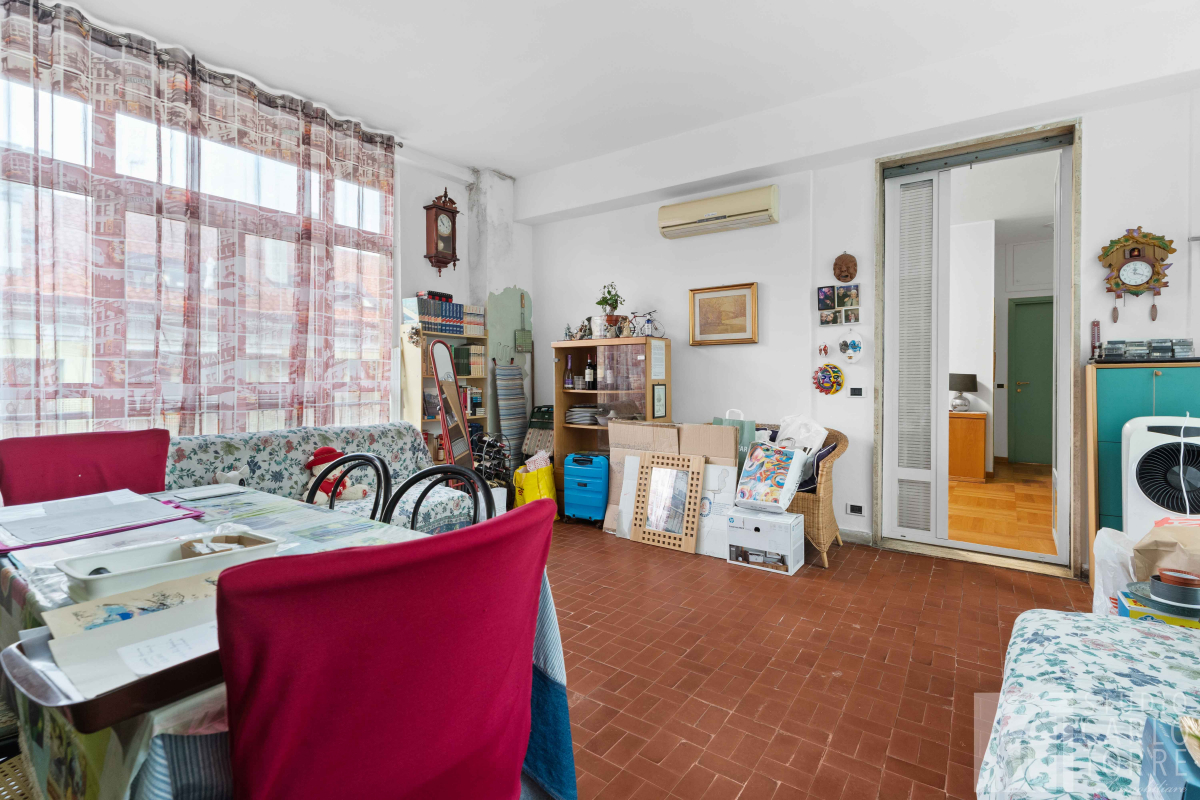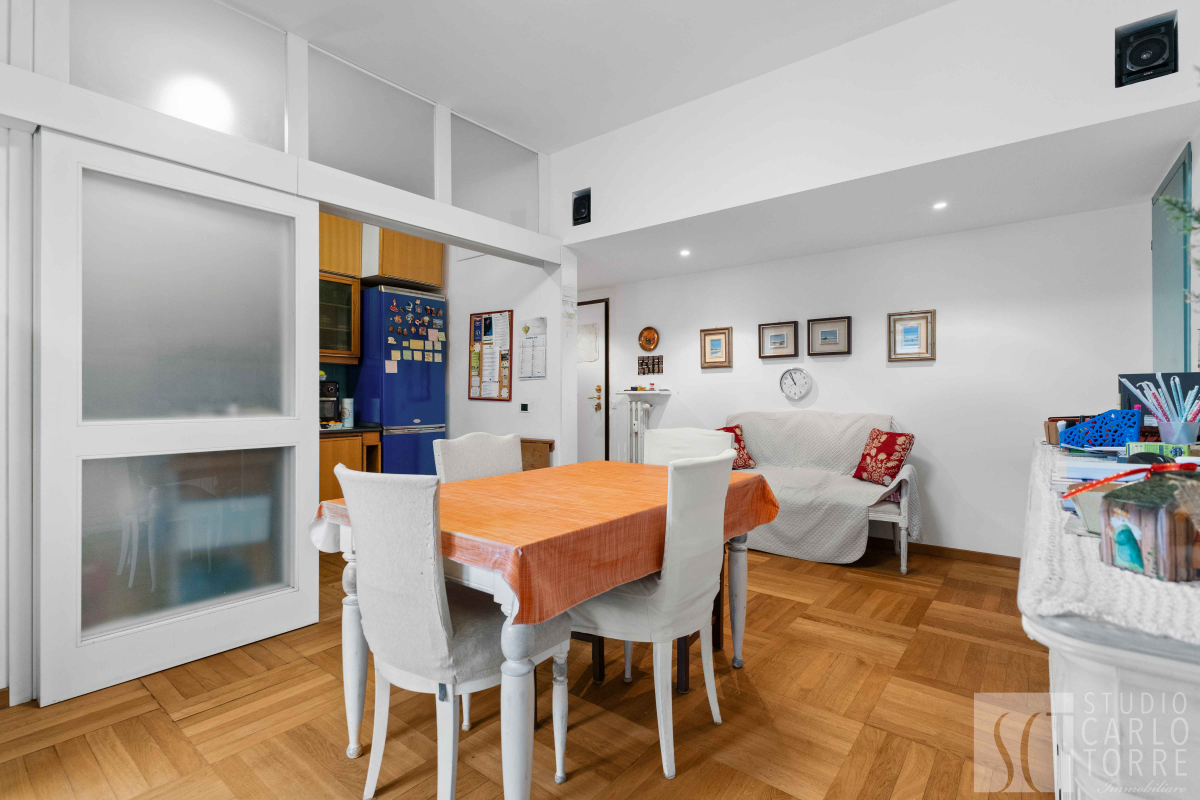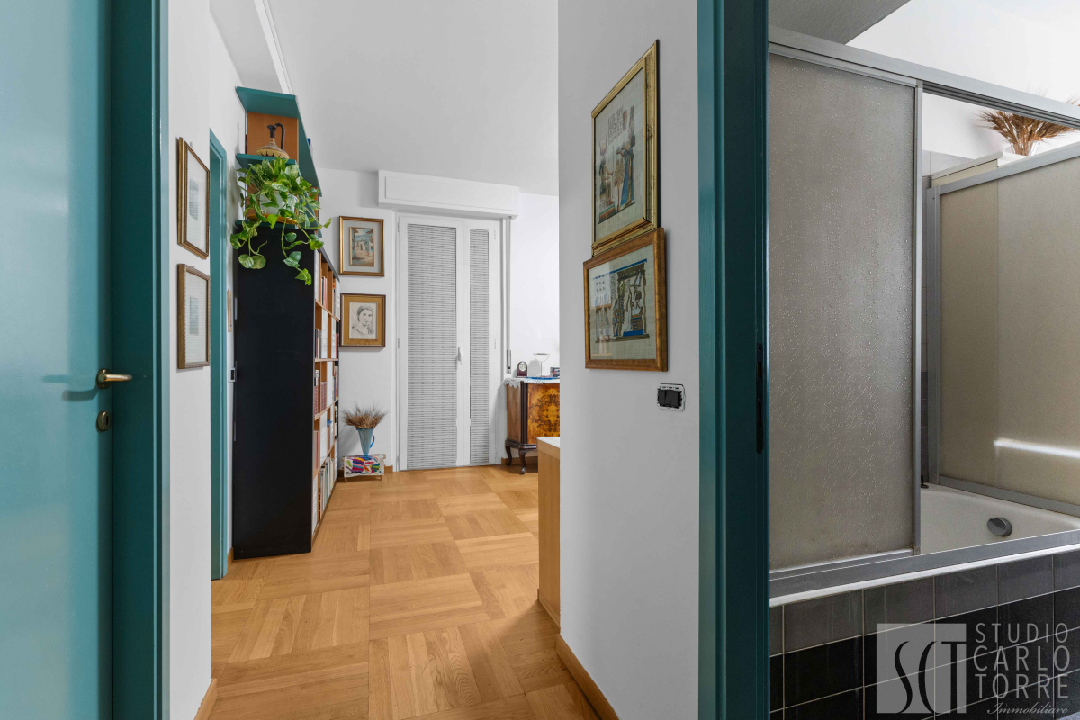 La luminosità dell'appartamento è accentuata dalla sua favorevole esposizione e dal piano alto, offrendo splendide vedute sulla città. La disposizione degli spazi interni è stata pensata per massimizzare comfort e funzionalità.